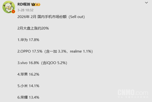 【CNMO科技消息】据CNMO了解,数码博主“RD观测”公布的2026年2月国内手机市场份额数据显示,华为以17.8%的份额位居第一,OPPO系(含一加、realme)以17.5%紧随其后,vivo系(含iQOO)以16.8%位列第三,苹果以16.2%滑落至第四,小米和荣耀分别为14.1%和13.4%。