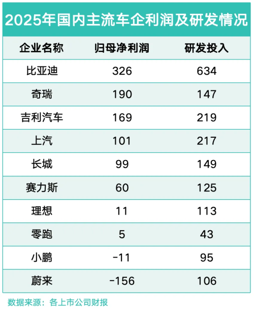 而高质量增长的秘诀就在于不断地投入研发,这也是各大车企之间拉开差距的决定性因素之一。2025年,比亚迪研发投入达634亿元,同比增长17%。而吉利、上汽、长城、奇瑞研发投入分别为219亿元、217亿元、149亿元、147亿元。