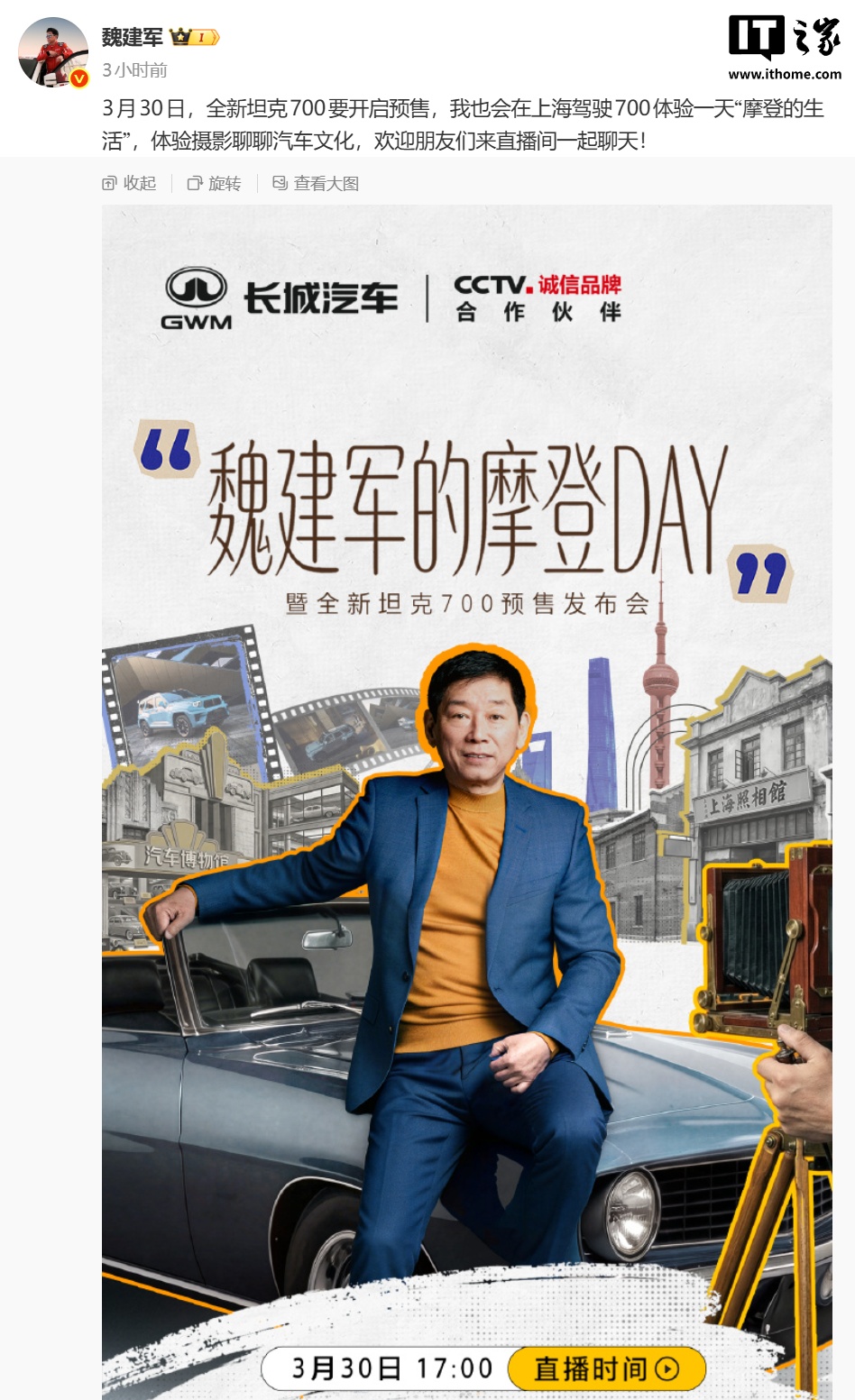 IT之家 3 月 29 日消息,长城汽车董事长魏建军今天在微博宣布,全新坦克 700 汽车将在 3 月 30 日开启预售。他届时会在上海驾驶 700 体验一天“摩登的生活”并开启直播,体验摄影聊聊汽车文化。